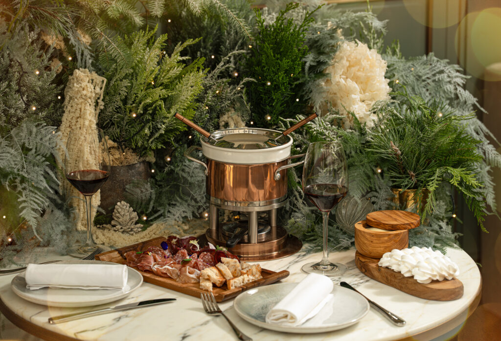 The Peak Lounge — part of the hotel’s spa area by day — channels a modern chalet as Fondue Nights, City Lights takes over from 8pm to 10pm with skyline views and a laidback yet buzzy après mood. A classic cheese fondue is served for sharing with artisan sourdough, potatoes and cured meats, with charcuterie and optional sides such as parmesan fries. French and Italian wines are poured to match with Laurent-Perrier cocktails for a sparkling lift. Dessert keeps the Alpine thread with a delicate Swiss cheese meringue followed by decadent hot chocolate.