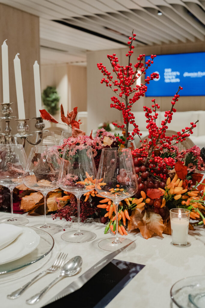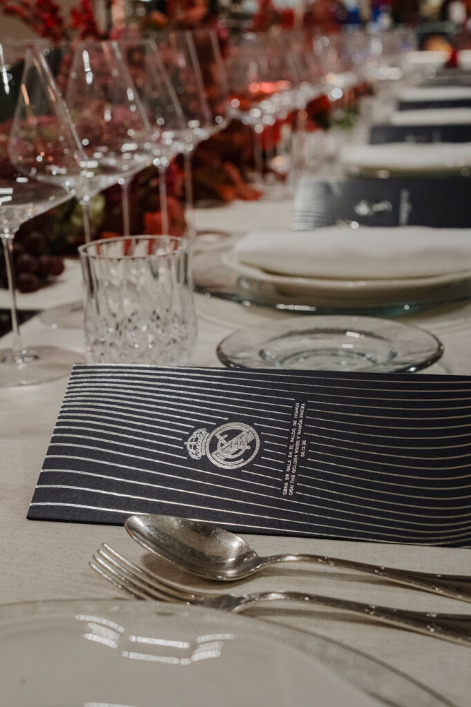 The setting was conceived as haute couture rather than corporate hospitality. Guests dined at a single, dramatically elongated table in the Palco de Honor, dressed with sculptural florals and candlelight, with uninterrupted views onto the presidential seats and the pitch below.