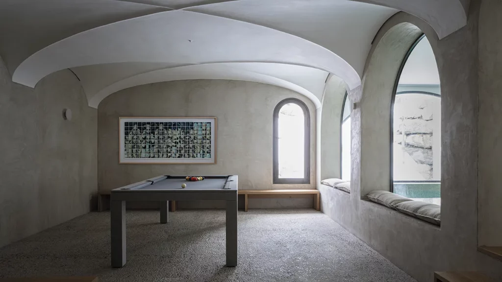 The aesthetic aligns with Bozzi de Brabant’s tastes throughout, but her husband, the founder of a data and A.I.-transformation company, is drawn to the lower levels in particular—because that’s where the fun is. Arches—another recurring motif—frame a sauna and a small indoor swimming pool. To shield the latter from the street outside, flowers and other foliage were planted to create a small forestlike privacy garden that blooms in the spring and summer. Adjacent to the pool sits a billiards room—or the dancing room, as she calls it, since it doubles as the setting for parties. Underfoot is the same stone found in the entrance, but on a larger scale.
