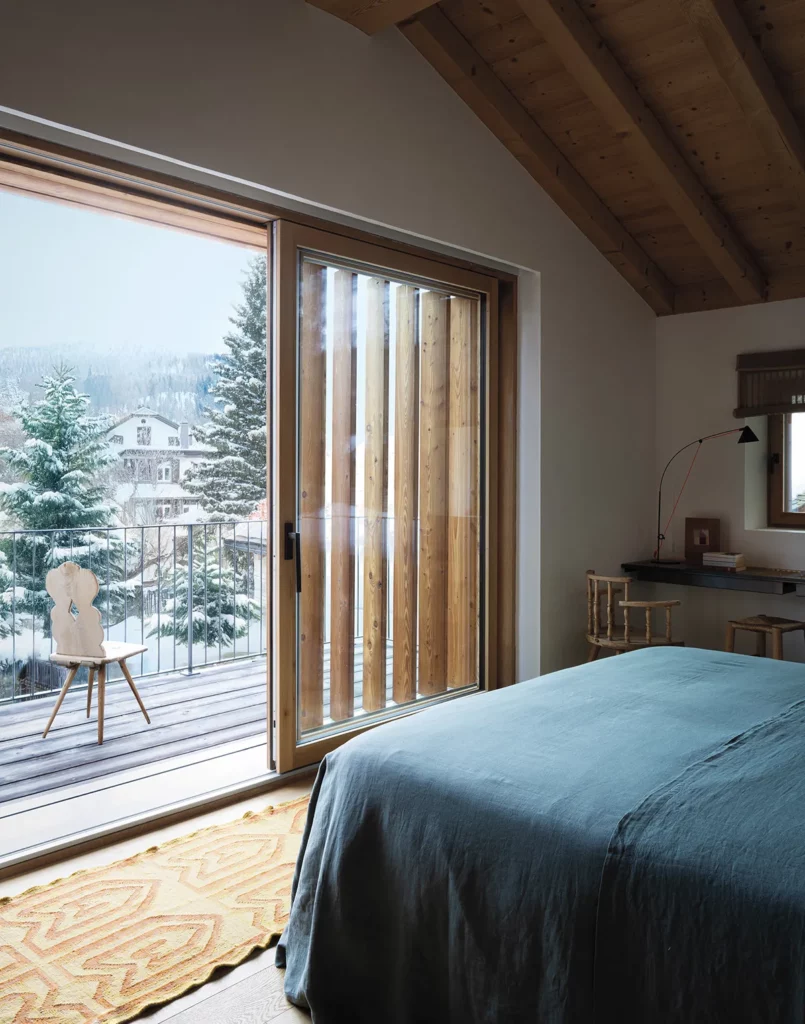 Bozzi de Brabant and Tartufoli spent time studying the local architecture, noting common features such as slightly sloped walls (she says it’s so the snow can slide down the facade) and small windows rather than large glass expanses or terraces. They ended up incorporating all of these components in the property. Tartufoli and his team even went out and measured the area’s traditional buildings so that they could get the proportions just right.