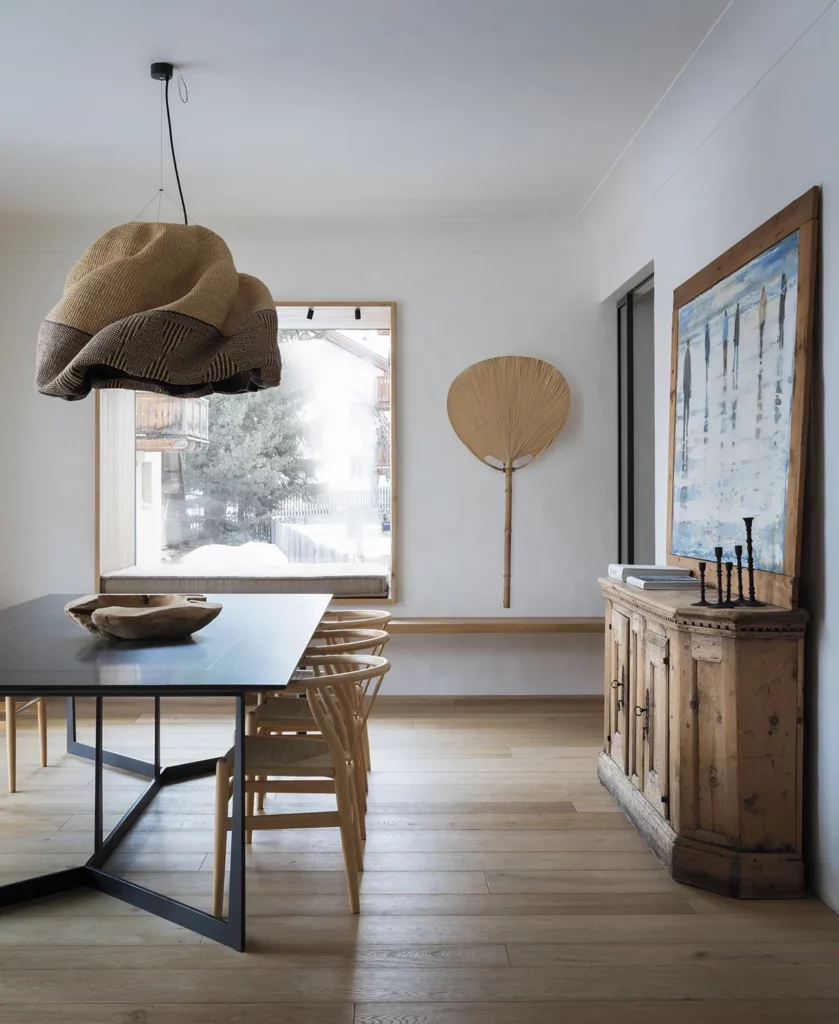 Other delights on the main floor include the custom sleek matte-black kitchen by Boffi—again inspired by a trip to the Susch—and the sculptural fabric lamp that hangs over the dining table, which Bozzi de Brabant found at Milan’s Rossana Orlandi gallery.