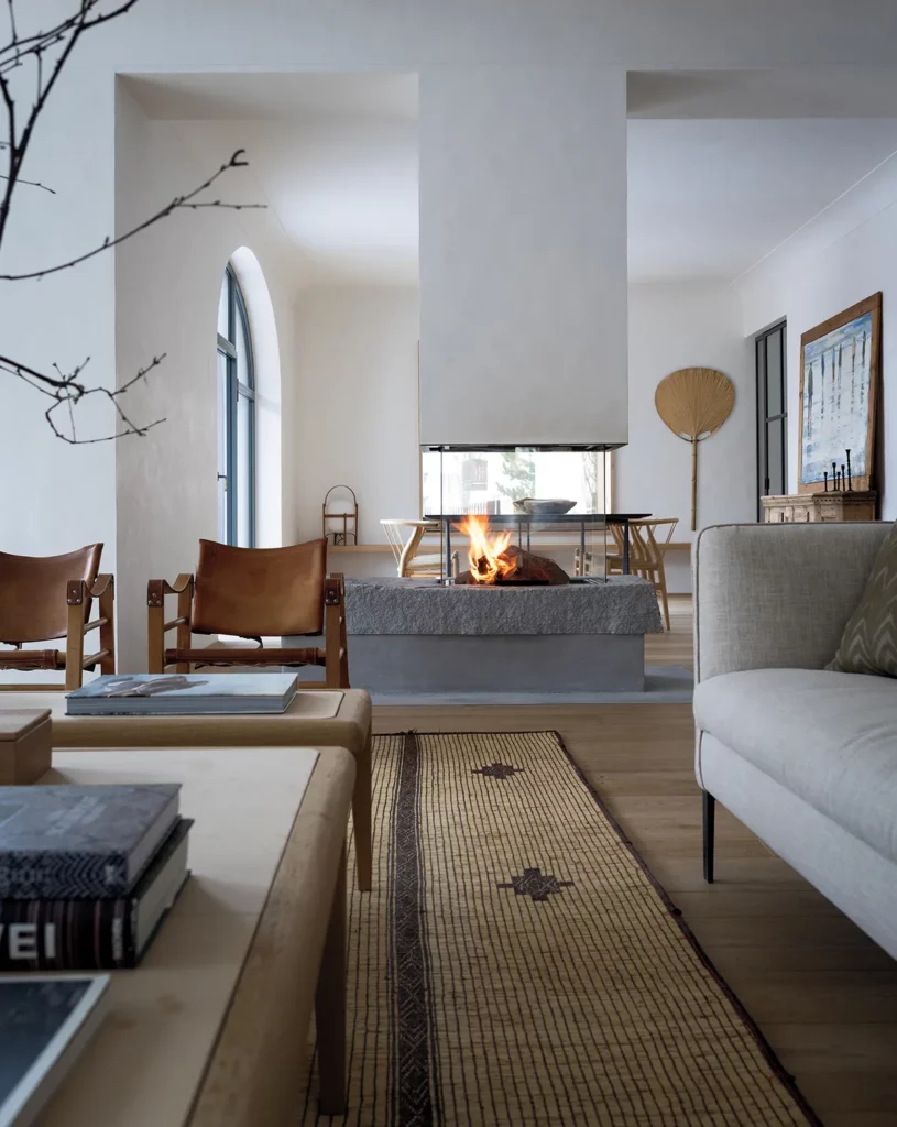 Much of the layout stayed the same from concept to reality, but Bozzi de Brabant was persuaded to change her mind on one standout feature in the main room: the fireplace. Sitting between the living room and the dining room, it’s practically a piece of art, with the chimney seeming to float above the hearth. “In my opinion, I always thought [a fireplace] was on a side of a wall,” she recalls. “But there the architect convinced me and pressed me to construct it in the center… because his idea was that if you enter and you immediately see everything, you discover everything in only one view. You lose a bit of the surprise of the house.”