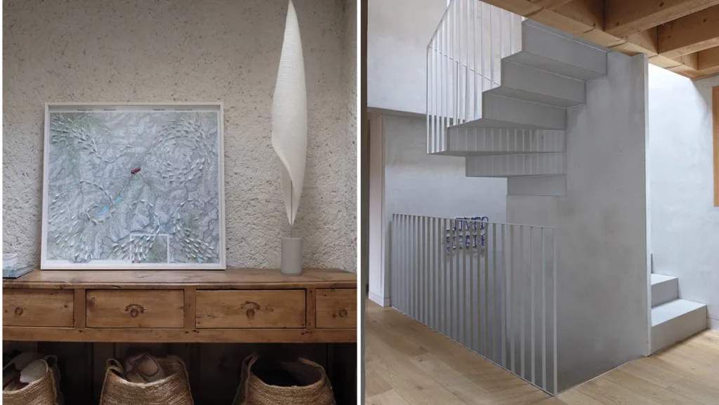 Inside, the home comprises four levels and approximately 3,400 square feet. Bozzi de Brabant’s favorite part of the house is the entrance, with its risciu-stone floor, although Tartufoli originally wanted to use a more classic parquet. Risciu is typically used outdoors in the Engadin; the homeowner had seen it used at Muzeum Susch and ended up finding the material herself. (In fact, despite studying business in school and working for ITA2030, a pro bono consulting firm that aids nonprofits, Bozzi de Brabant sourced all the interiors, with some input from interior-designer friends and Tartufoli.) A skylight brightens up the foyer from high above, and a personalised artwork featuring a map of the Engadin from her parents takes pride of place on the entry console—squint, and you might be able to make out the family’s little red car traversing the roads.