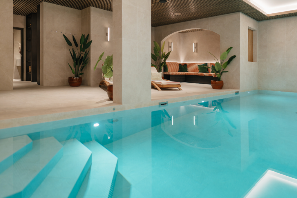 Where the chalet really differentiates itself from older homes is on the lower levels. Two entire floors are dedicated to wellness and entertainment. There’s a large indoor pool, sauna, steam room, jacuzzi, and massage room, plus a private cinema with recliner seating and its own bar and snack area. A climate-controlled wine cellar rounds things out.