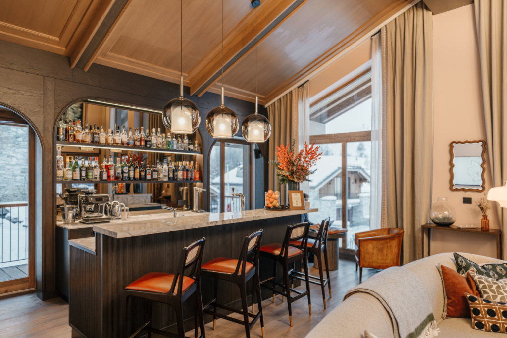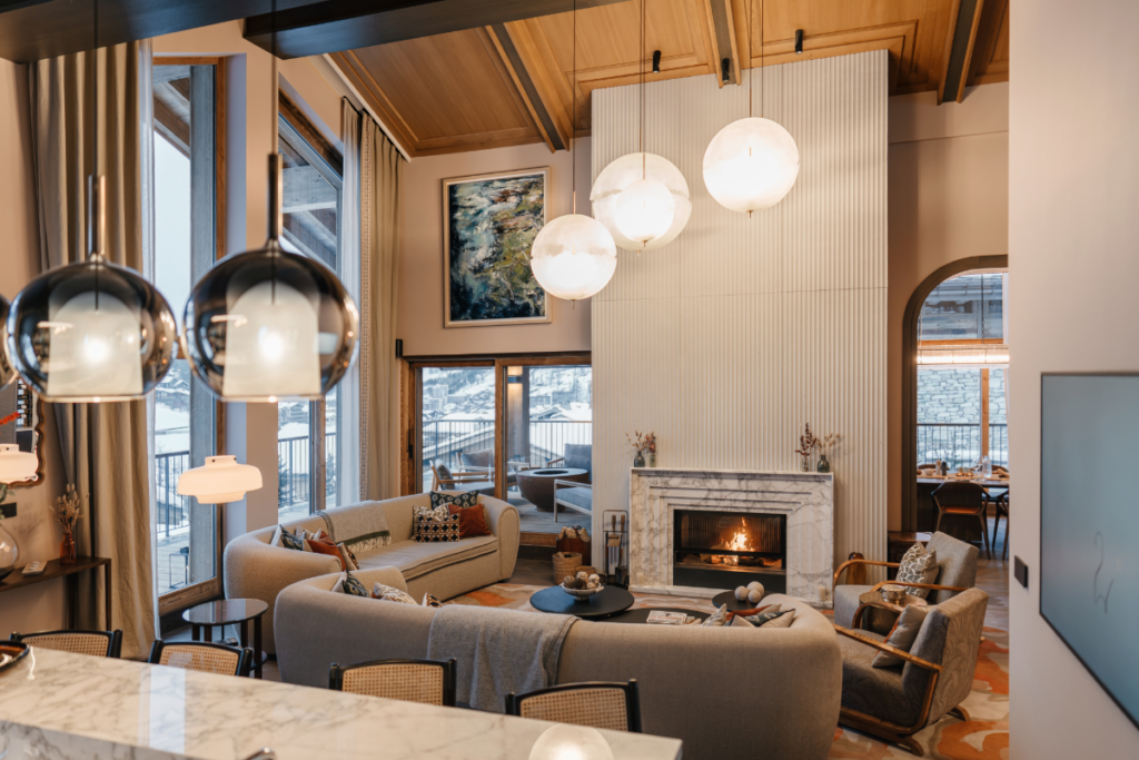 Finished in late 2025 after four years of planning and construction, the three-story residence is substantial without being showy. Spread across more than 1,00 square metres, interior spaces lean into a clean, contemporary look—think natural stone, warm woods, and soft, modern finishes—rather than the overtly rustic style exemplified by many of the older chalets in the resort.