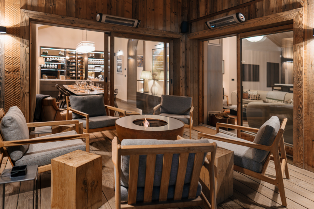 At the top of the house, a double-height living space acts as the social hub. A wood-burning fireplace anchors the room, flanked by a bar, a professional kitchen, and an intimate dining area. Floor-to-ceiling glass pulls the mountains right into the space, while wide wraparound terraces are ideal for late-afternoon après-ski gatherings.