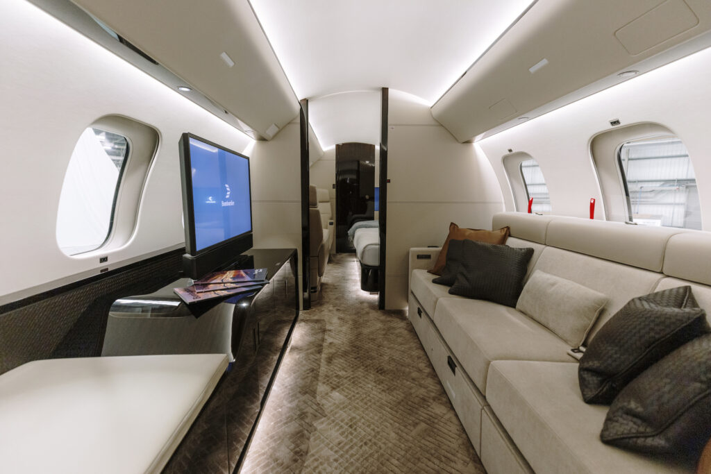 Inside, flyers can enjoy four distinct living zones designed to support the shifting rhythms of long-haul travel. A forward club suite creates a relaxed setting for conversation or informal meetings, while a conference and dining zone is designed for working lunches, boardroom-style discussions and entertaining at altitude. Further aft, a private principal suite offers a quiet retreat for rest, with the option of a full-size bed and increased personal storage. An aft lounge completes the layout, configured for unwinding, films or additional sleeping accommodation on ultra-long missions.