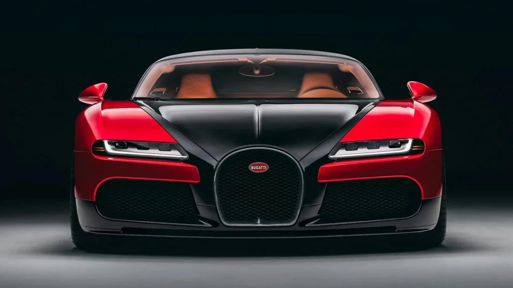 Another standout feature is the exterior’s dual-tone paint scheme, which comprises multiple layers that include a red clear coat atop a silver-aluminum one. Complementing this is black exposed carbon fiber bolstered in appearance by a black clear coat. The entire presentation rides on bigger wheels than the Veyron, now with the Chiron’s 20-inch and 21-inch setups in the front and rear, respectively. It also benefits from the Chiron’s brakes (420 mm rotors with eight-piston calipers).