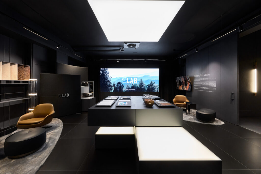 Behind F/LIST’s elegant finishes lies a culture of experimentation. At its Austrian HQ, engineers and artisans work together in F/LAB, developing new materials and sustainable solutions. Recent breakthroughs include Shape Shifter, a transformable aircraft furniture concept with integrated electronics; Whisper Leather Waveline, an ultra-light plant-based alternative to traditional hides; and reconstituted veneers with UV-resistant varnishes for exterior yacht use. Even waste such as apricot stones and cork is reimagined as decorative panels through circular economy processes.
