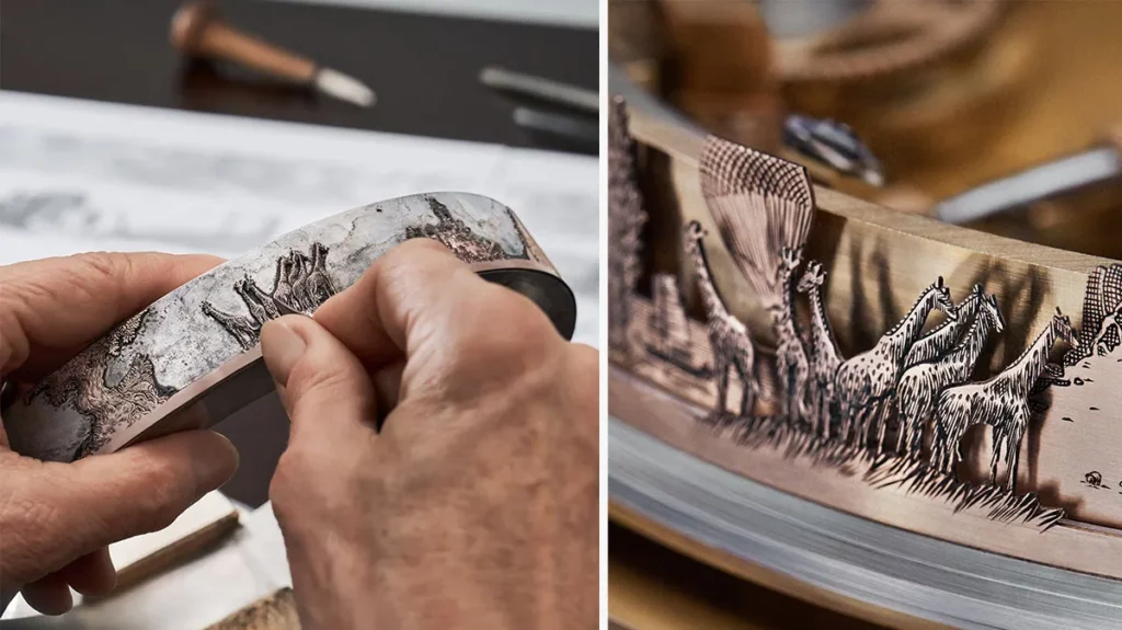 First conceived by Abraham-Louis Breguet in 1795, the sympathique clock was a way to automatically synchronize a portable pocket watch with a more precise master clock. The LVDB-003 Sympathique is made of titanium, meteorite, and rose gold. Weighing 22 lbs and measuring 310 mm by 266 mm by 260 mm, this is a substantial piece of time-telling that boasts mechanics and art in equal measure. Take, for instance, the clock’s waist, which is an animated piece of art by Belgian artist Francois Shuiten, engraved by Rothen. Drawing inspiration from early 19th-century dioramas, Schuiten created three landscapes featuring scenes of exploration, including a steam train, hot-air balloons floating above the African savanna, and sherpas ascending steep mountains. These miniature worlds encircle the mechanism and rotate slowly on hand-engraved 5N rose-gold rings.