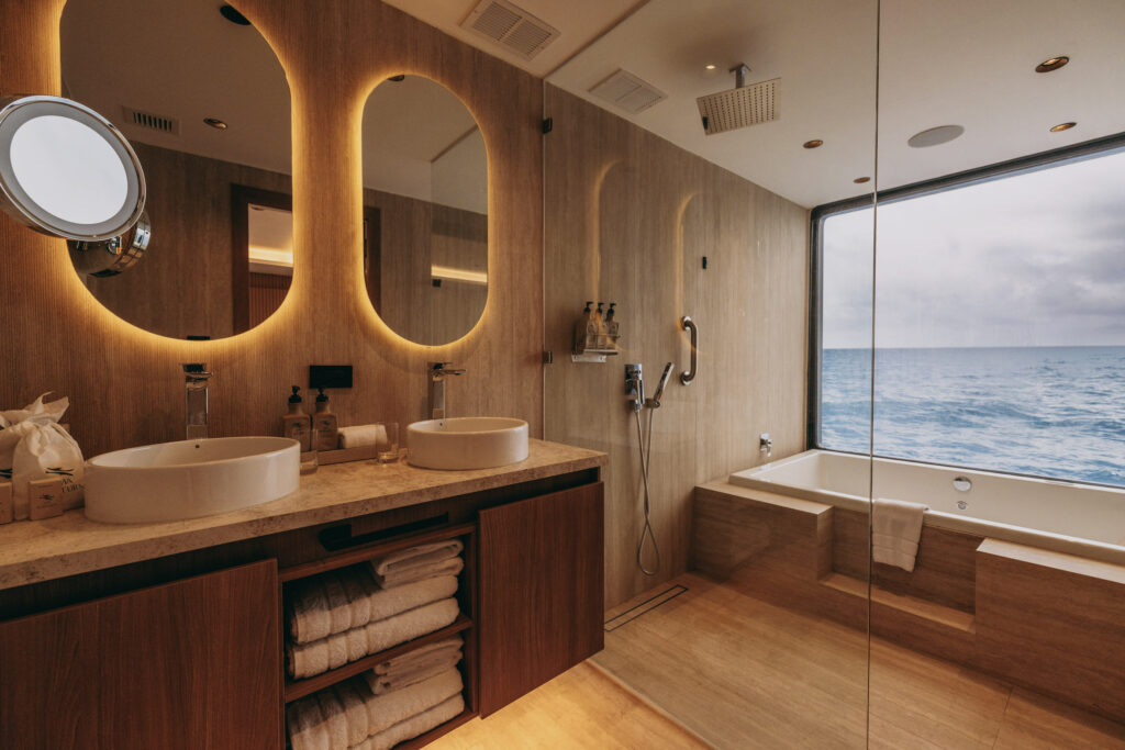 Accommodating 20 guests in 12 beautifully designed suites, each suite is a private sanctuary with floor-to-ceiling windows, private balconies, Jacuzzi baths positioned for ocean views, rainfall showers, walk-in wardrobes, and mini bars stocked with complimentary snacks and guests’ preferred drinks (before travelling, guests are asked to complete a preference sheet, and for me, a bottle of gin appeared without ever needing to ask). For those seeking even more space and seclusion, the 70 m² owner’s suite can be created by combining two main-deck suites into one expansive living space, complete with two private balconies and a separate lounge.