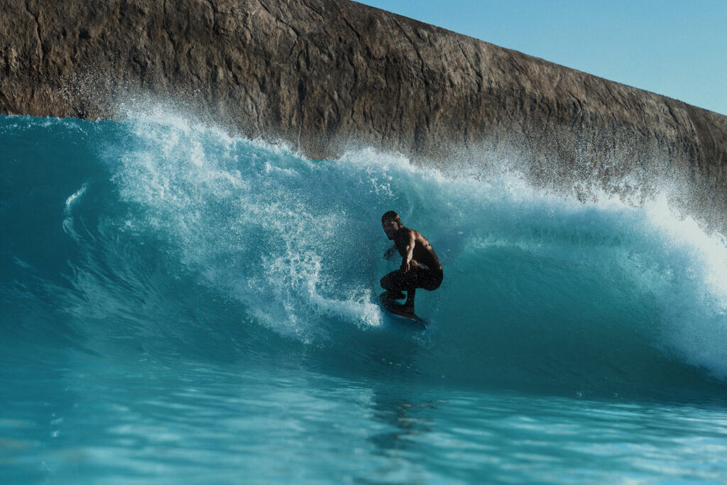 The first stop the next morning is ADRENA, an eight-kilometre drive north of Shura Island in the Red Sea’s adventure district. Part water park, part beach club, part extreme sports hub and part watersports school, the development has a three-storey tower at its centre, the view from which takes in Saudi Arabia’s largest surf pool, where the waves are finely tuned by a technician and dialled into the specific skill set of the surfer.